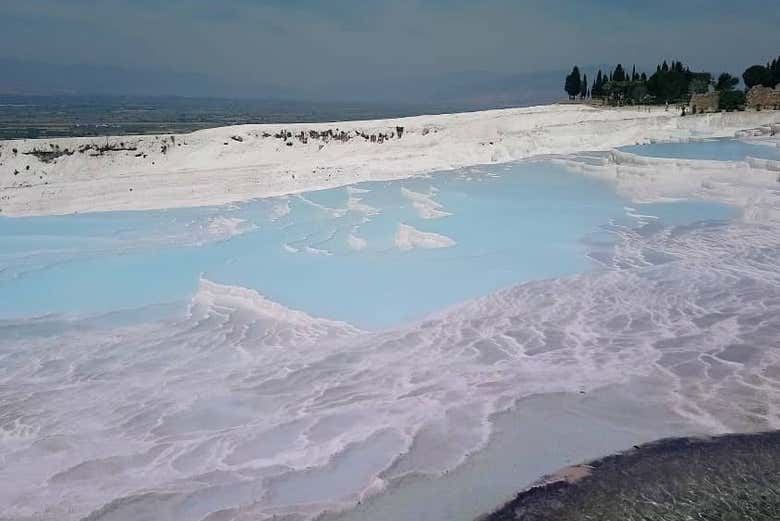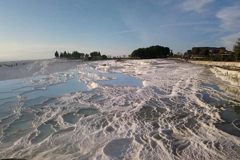 La aventura comienza con la recogida en tu hotel de Dalaman a la hora acordada. Tras un viaje de aproximadamente tres horas hacia el norte, llegarás a Pamukkale, donde te esperan sus famosas terrazas blancas de travertino. Descubrirás el origen de su color característico y las propiedades que se atribuyen a estas aguas termales.