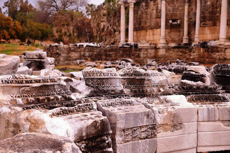 Por la tarde, visitarás la cascada de Manavgat, un salto de agua de 2 metros de altura que se extiende a lo largo de 40 metros, creando un paisaje idílico perfecto para fotografías. Finalmente, explorarás la ciudad histórica de Side, fundada por colonos griegos en el siglo VII a.C., donde verás la puerta helenística, la plaza del ágora y el templo romano dedicado al dios Apolo, un lugar vinculado a la leyenda de Marco Antonio y Cleopatra. El regreso a tu hotel está programado entre las 17:30 y 18:30 horas.