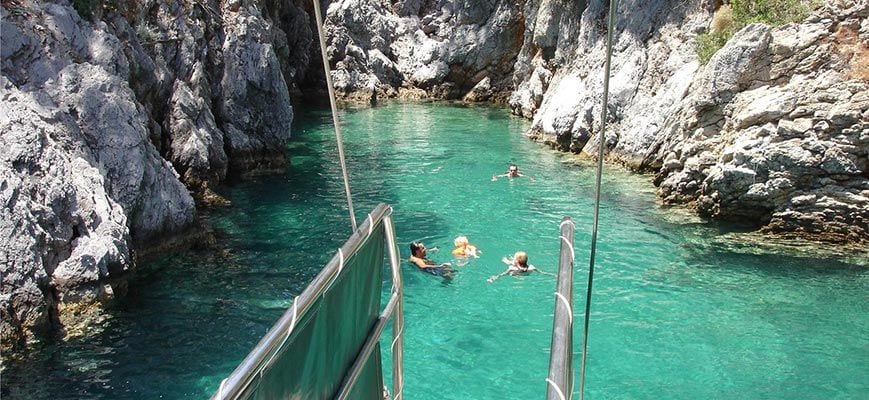 Después de un delicioso desayuno, retomaremos nuestra singladura a lo largo de la costa, llegando justo a tiempo para almorzar en la Bahía de Cleopatra, nombrada después de que la legendaria faraona y reina de Egipto Cleopatra l, recalara aquí y la hiciera su zona de baño particular durante cierto tiempo. En estas aguas cristalinas si mira cuidadosamente en el mar puede ver las ruinas de un Hamam o baño turco. Tras el almuerzo, navegaremos durante 45 minutos hasta la bahía de Ağa. Allí podemos bajar a tierra y recorrer a pie el lugar, en donde persisten las ruinas de un antiguo teatro romano. La cena será en el barco y pasaremos la noche anclados en esta bahía. Las rutas que les ofrecemos pueden ser modificadas, pues los veleros dependen de las condiciones meteorológicas para la navegación.