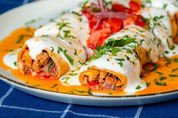 Continuarás con el çiğ köfte, un plato de carne roja con salsa de granada, seguido de la famosa islak burger, una hamburguesa al estilo turco. Para los amantes de la carne, se incluyen kokorec, bocadillos de cordero, y gözleme, un pan relleno de espinacas y queso feta. El tour culmina con un postre dulce, el sambali, ideal para los más golosos. Después de dos horas, te despedirás con el estómago lleno y una nueva apreciación de la cocina turca.